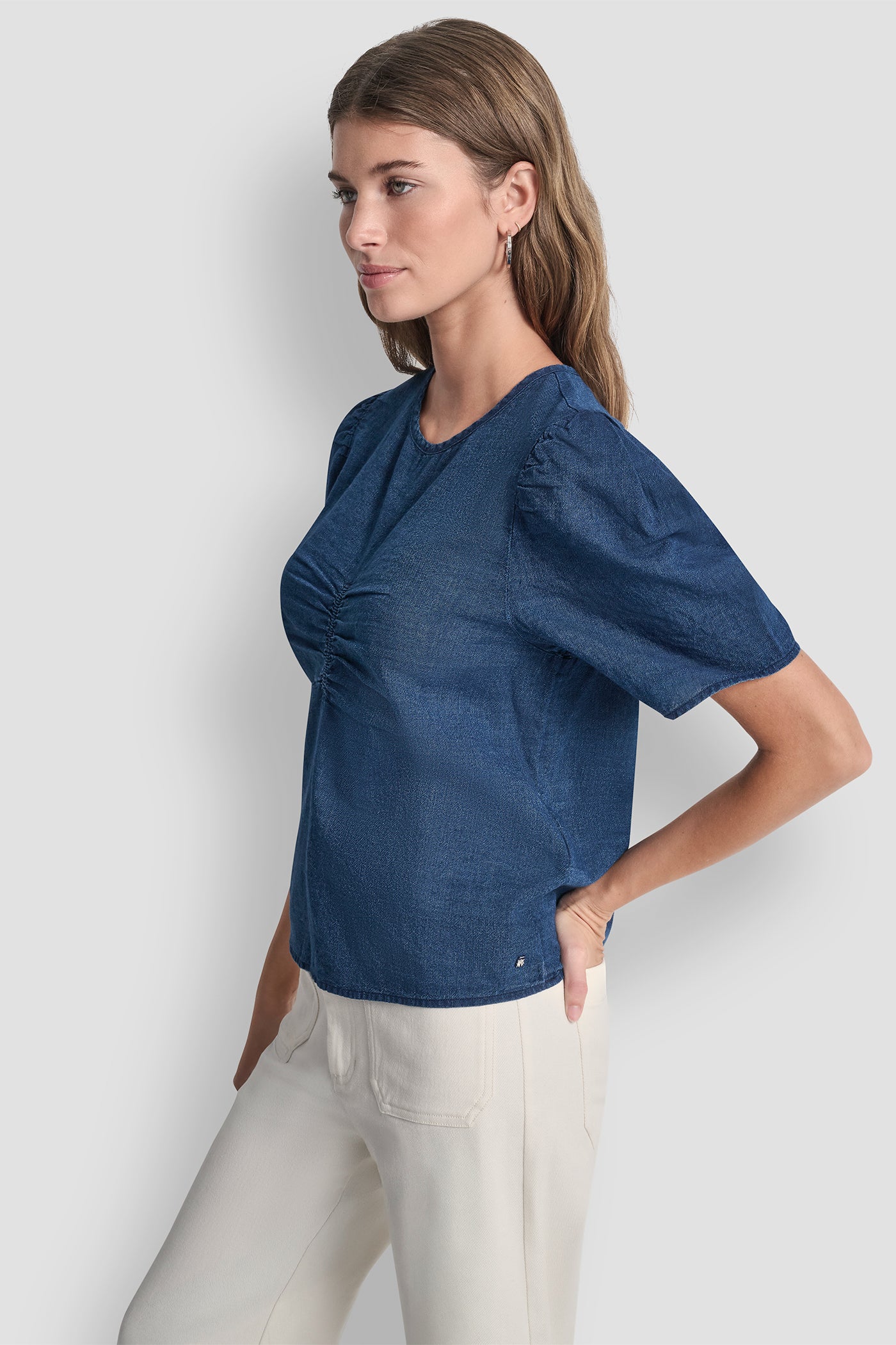 Elevate your everyday style with the DKNY Puff Short Sleeve Top in striking blue. Crafted from 100% cotton, this chic piece features trendy puff sleeves and a relaxed fit perfect for pairing with jeans or skirts for effortless sophistication.