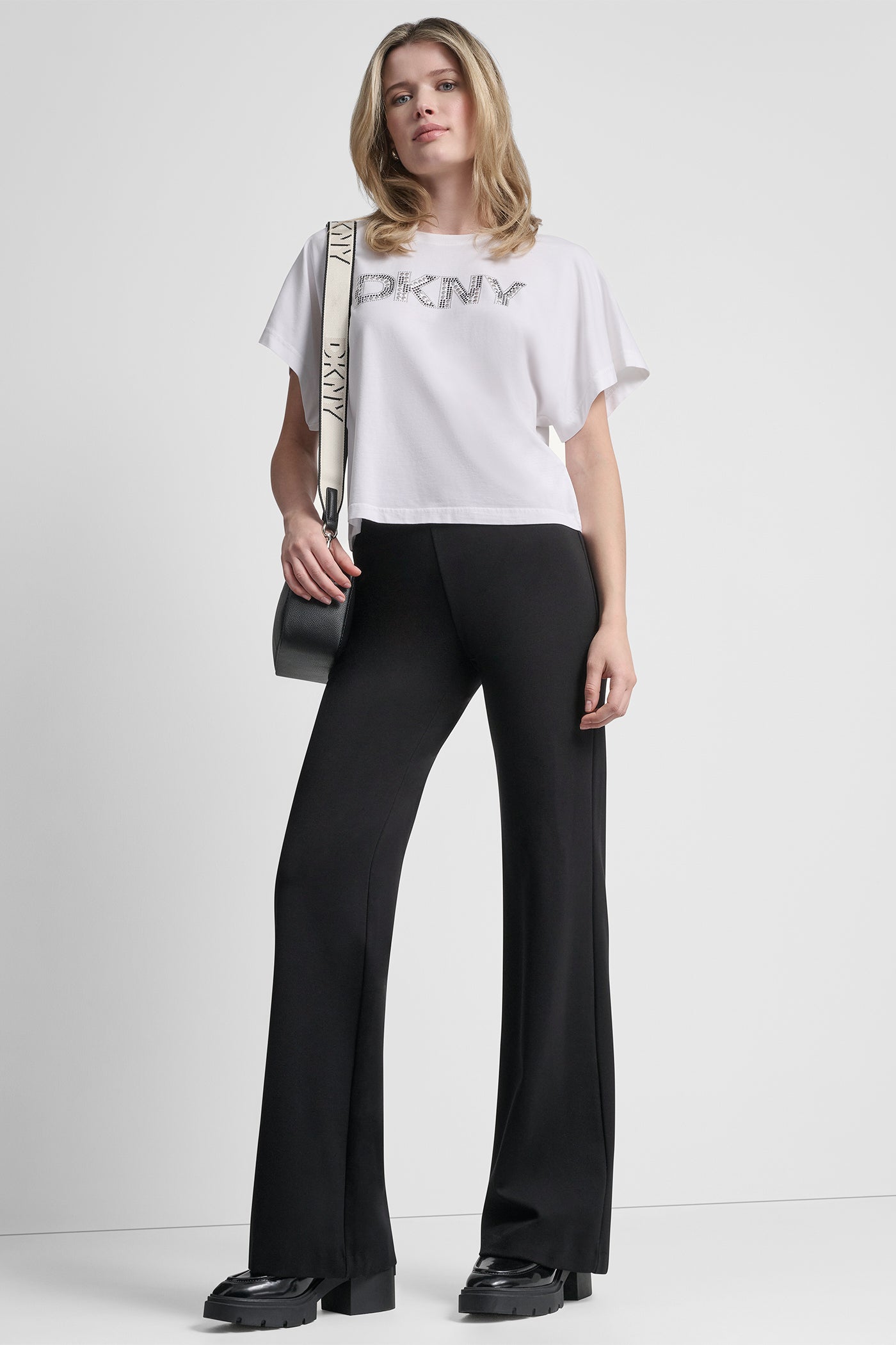 Elevate your basics with the DKNY Wide Sleeve CMS Bling Top in crisp white. Crafted from a soft cotton-modal blend with added stretch, this top features glamorous bling accents and modern wide sleeves perfect for effortless sophistication and all-day comfort.
