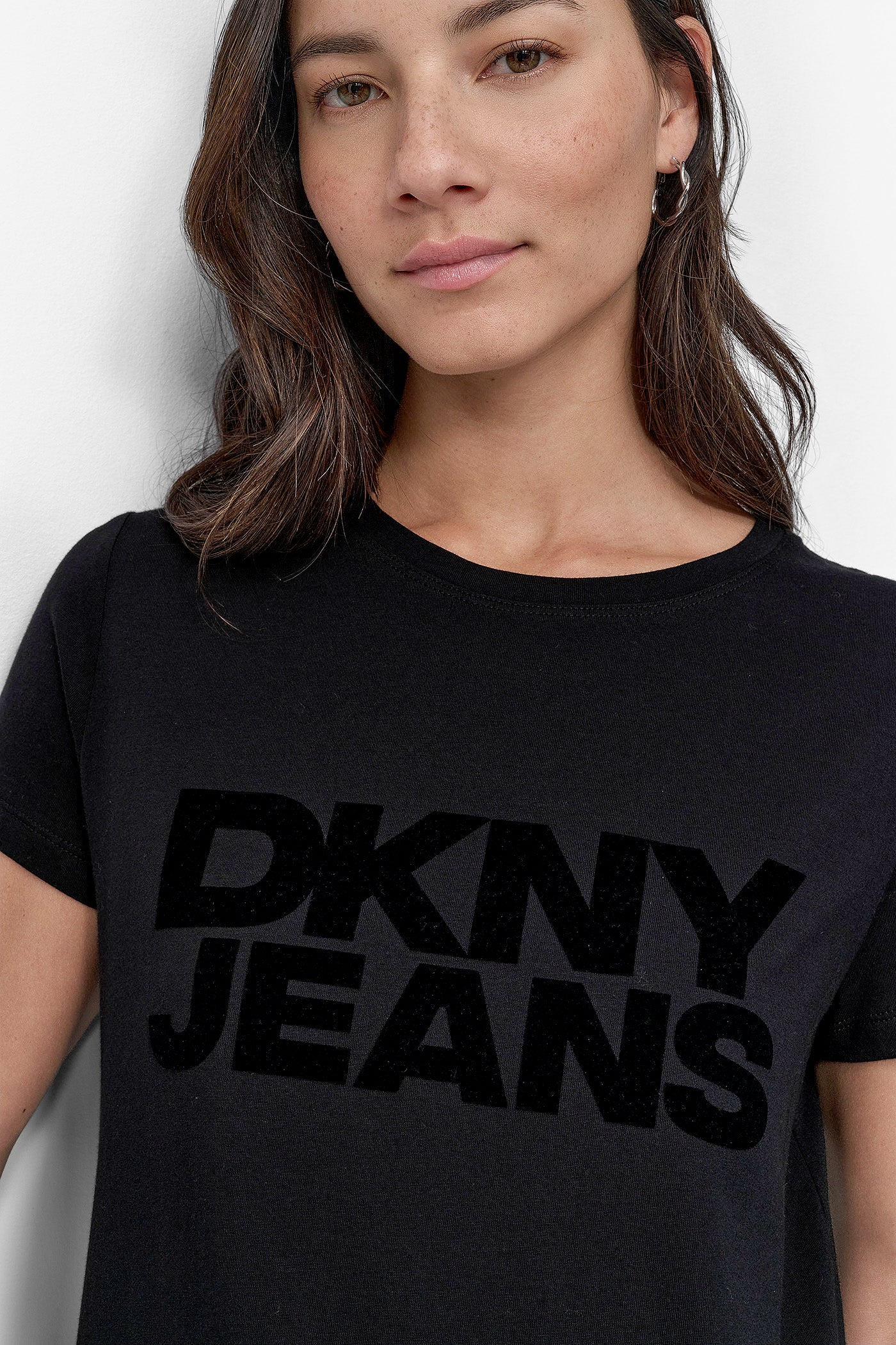 Elevate your basics with the DKNY Flocked Logo Crew Neck Tee in classic black. Featuring a soft cotton blend, timeless crew neckline, and bold flocked DKNY logo, this versatile top pairs perfectly with jeans or layers effortlessly under jackets for modern style. Item ID: DJ4T1265BBL