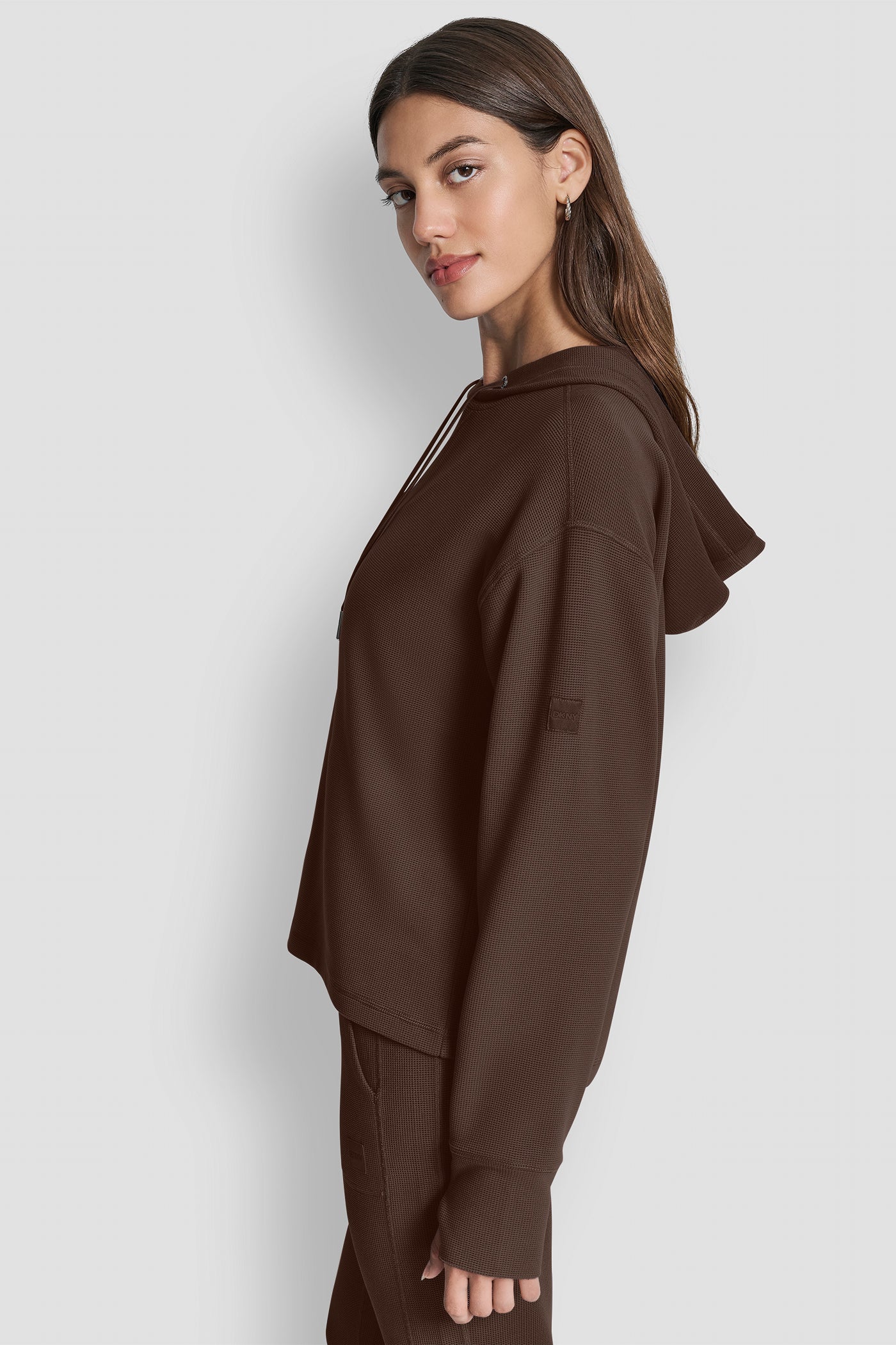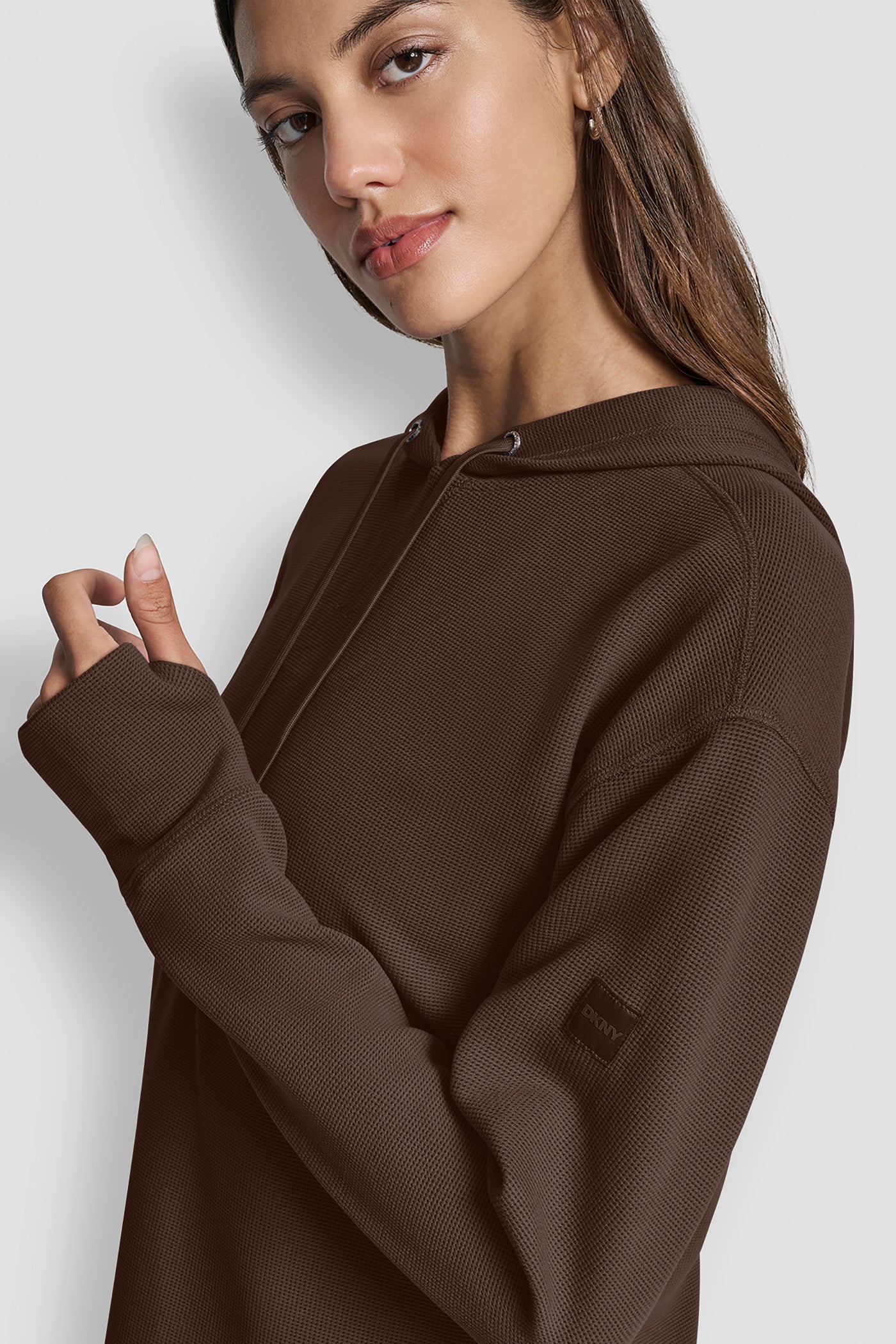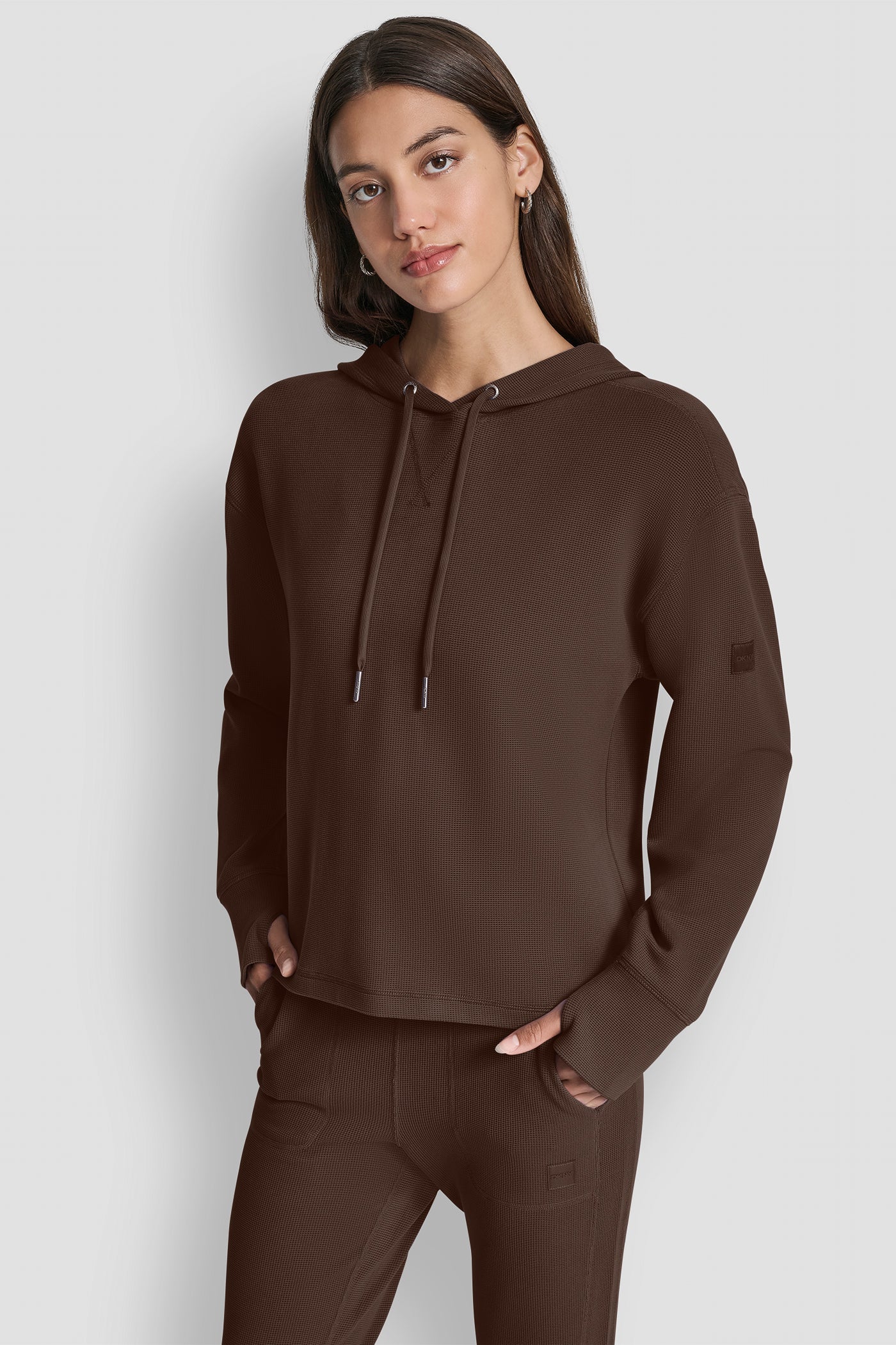 Elevate your casual style with the DKNY TRNDSD THRML PO HD sweatshirt in rich brown. Featuring a thermal knit design, comfortable pullover fit, and classic hood, this must-have piece seamlessly blends warmth, versatility, and contemporary trendsetting appeal for everyday wear. Item ID: DP5T1387ESP