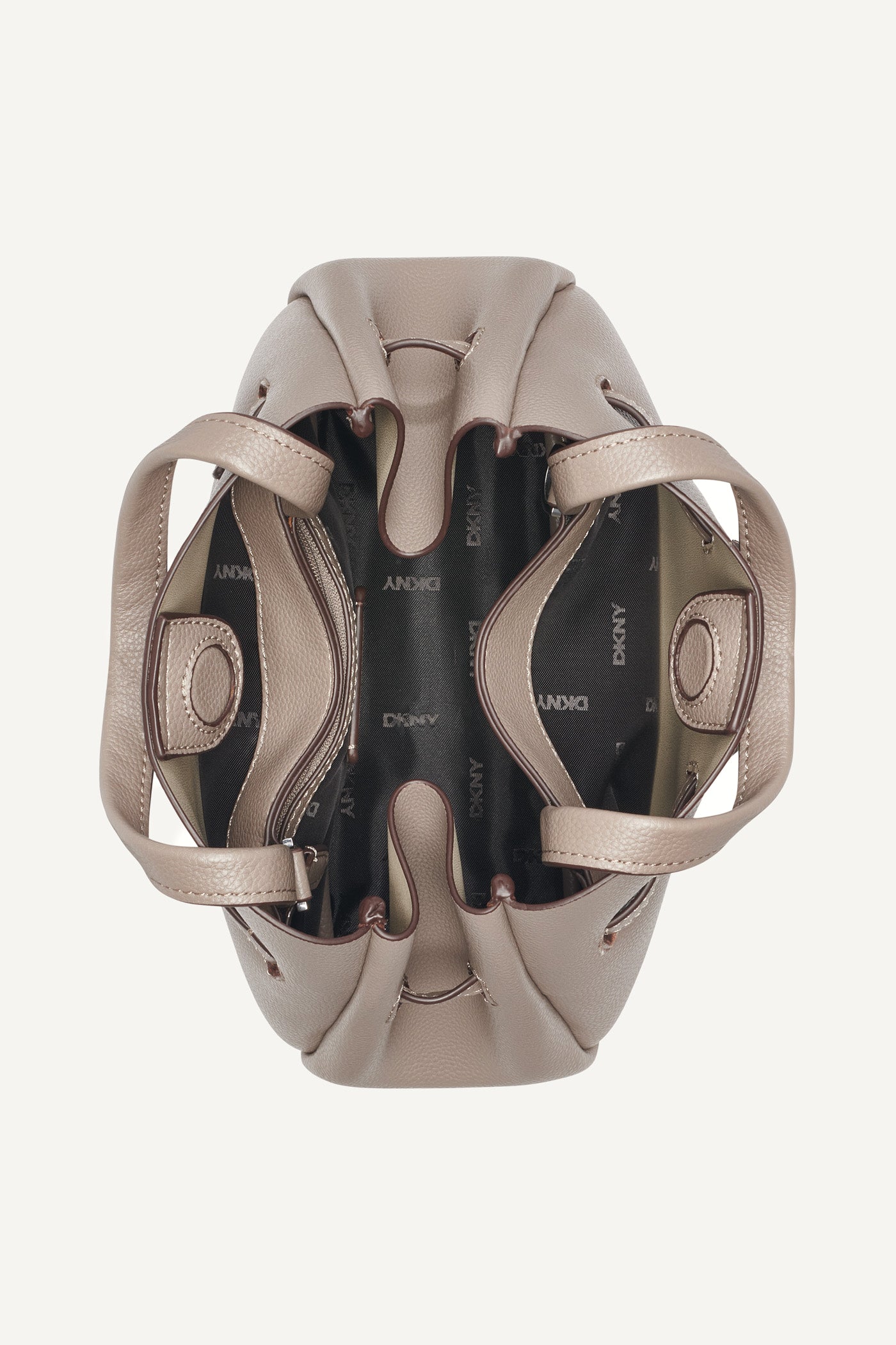 The DKNY Bryar Small Satchel in rich brown is a chic top-handle bag designed for modern sophistication. Featuring premium materials, gold-tone hardware, and a structured shape, it transitions effortlessly from day to night, combining style with everyday functionality. Item ID: R52DAK44MNK